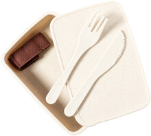 Box na jídlo z PP plastu se sadou příborů (nůž a vidlička) a elastickým popruhem. 700 ml.