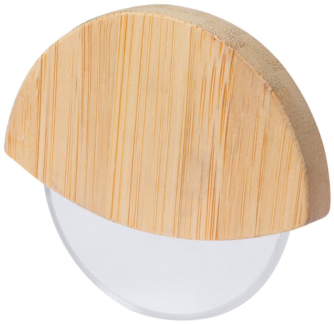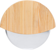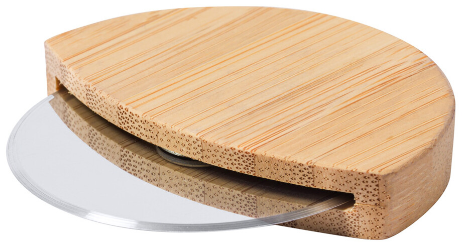 Kráječ na pizzu z nerezové oceli v bambusovém pouzdře.