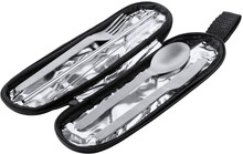 5dílná sada příborů z nerezové oceli v polyesterovém pouzdře RPET. Včetně vidličky, nože, lžíce, brčka a čisticího kartáčku.