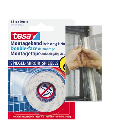 Silná oboustranná páska na upevnění zrcadel a jiných plochých předmětů ve vlhkých místnostech.