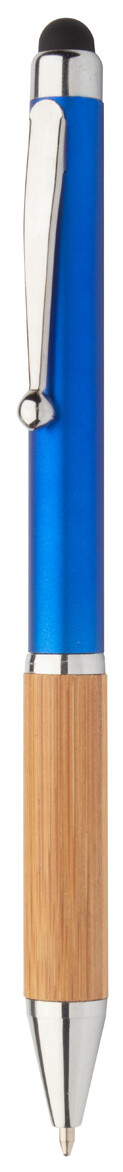 Plastové otočné kuličkové a dotykové pero s bambusovým úchopem, kovovým tělem a lesklými chromovanými částmi. S modrou náplní.