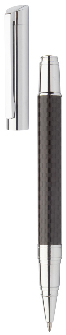 Elegantní sada kovového kuličkového pera a rolleru s karbonovým vzorem a lesklými chromovanými díly. V černé dárkové krabičce, s modrou náplní. Produkt značky André Philippe.