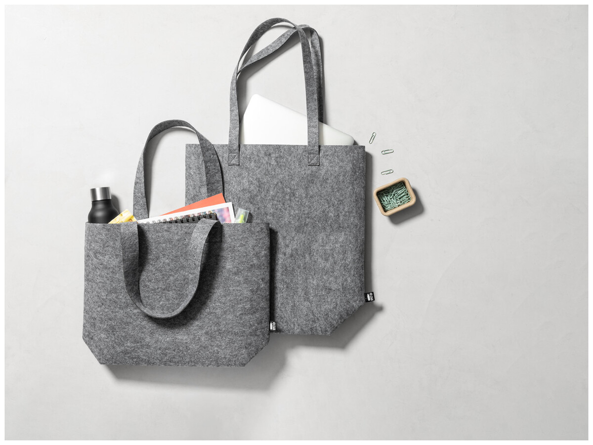 Nákupní taška z RPET plsti s dlouhými uchy a rozšířeným dnem. S výrazným štítkem RPET.