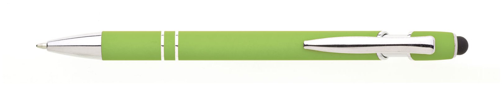 Propiska s touch koncem, měkkým pogumovaným soft povrchem ve světle zelené barvě a stříbrnými doplňky včetně dvou ozdobných kroužků. (NATIO)