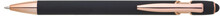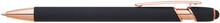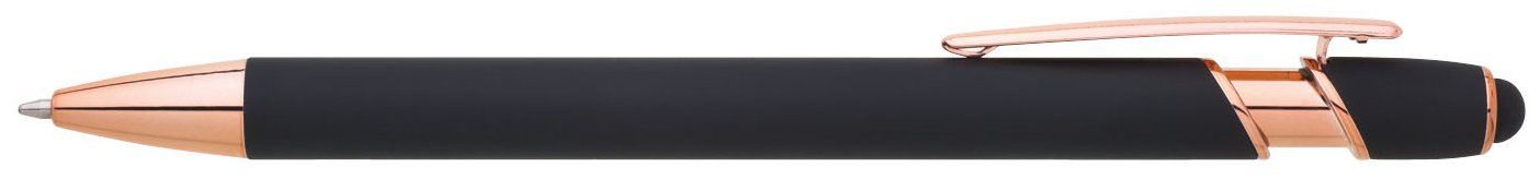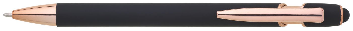Kovová propiska se soft povrchem, touch koncovkou a doplňky v růžovo-zlaté barvě. Laserované logo je lesklé, růžovo-zlaté. Náplň modře píšící.