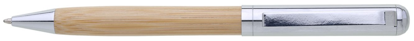 Otočná kovová propiska s bambusovou úchopovou částí. Součástí výrobku je papírová krabička.