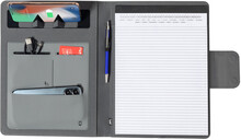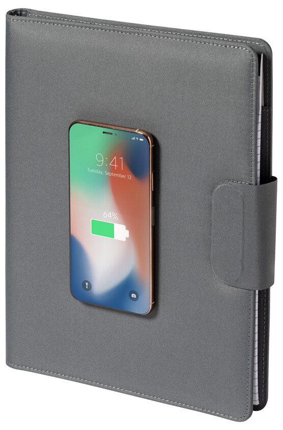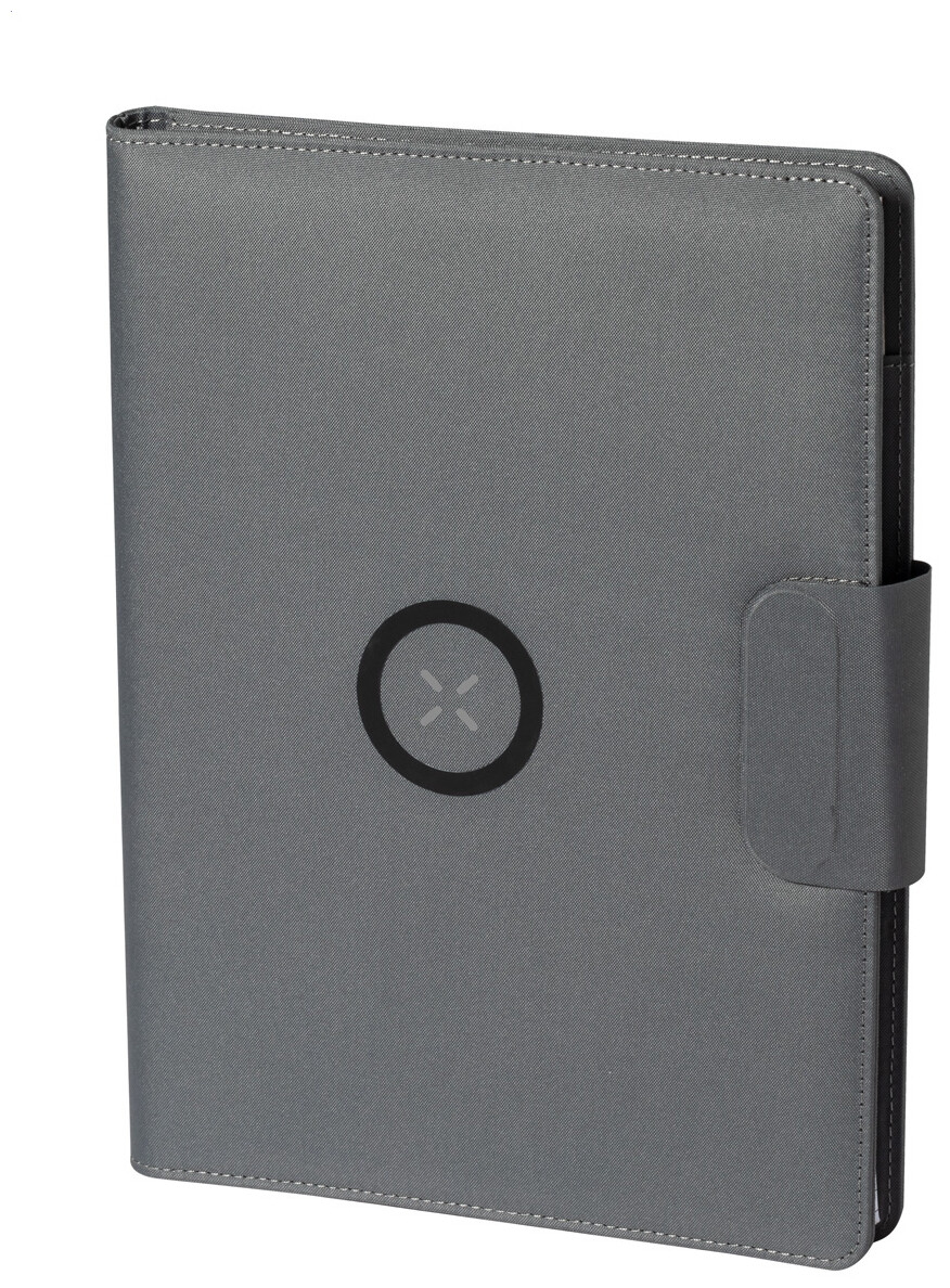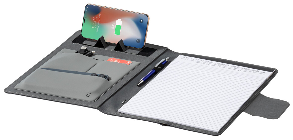 Polyesterová sloha na dokumenty A4 z 300D RPET s vestavěnou magnetickou bezdrátovou rychlonabíječkou (10W), powerbankou 5000 mAh s USB portem pro nabíjení, skládacím držákem na mobil a 20 linkovaným poznámkovým blokem. Včetně samolepícího kovového kroužku pro použití magnetické funkce na jakémkoli bezdrátově nabíjecím zařízení. Včetně USB nabíjecího kabelu.