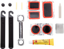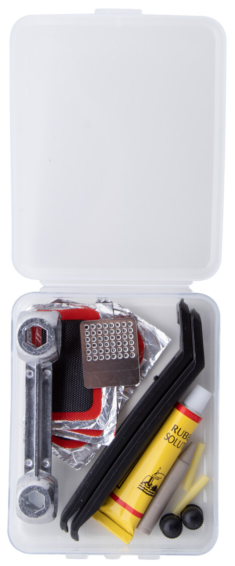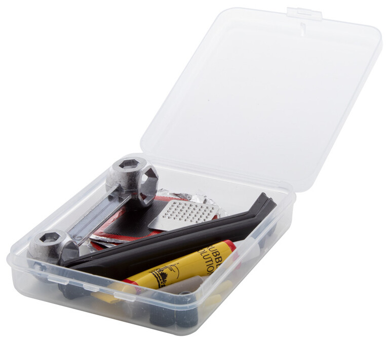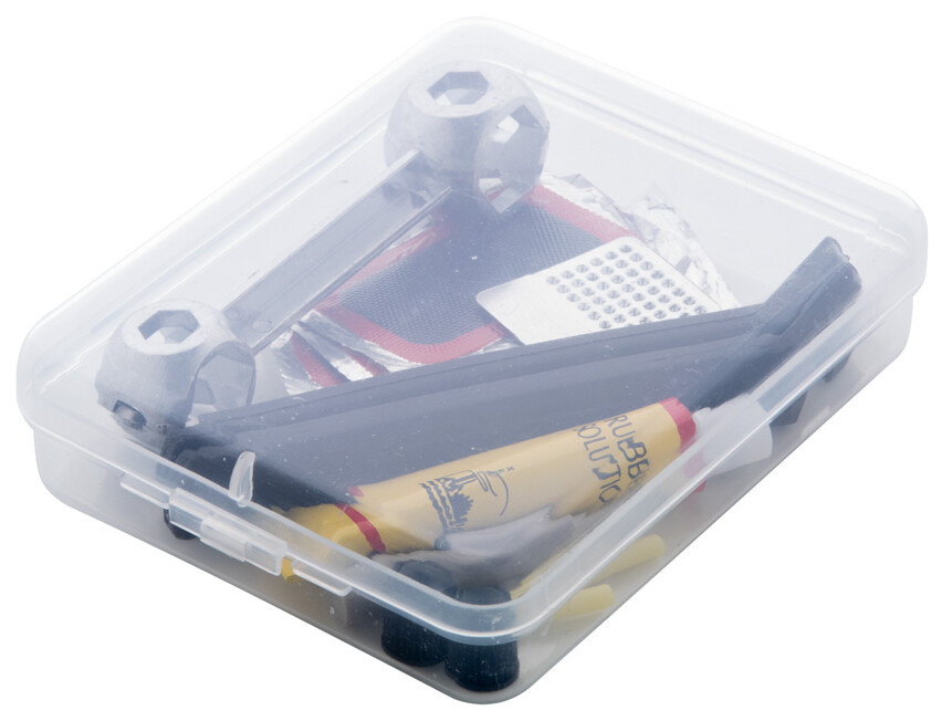 Sada na opravu jízdních kol v průhledném plastovém pouzdře z PP. Obsahuje šestihranný klíč a sadu na opravu defektu (2 páčky na pneumatiky, struhadlo, lepidlo, 2 krytky ventilů, 2 duše ventilků a 5 záplat na pneumatiky).