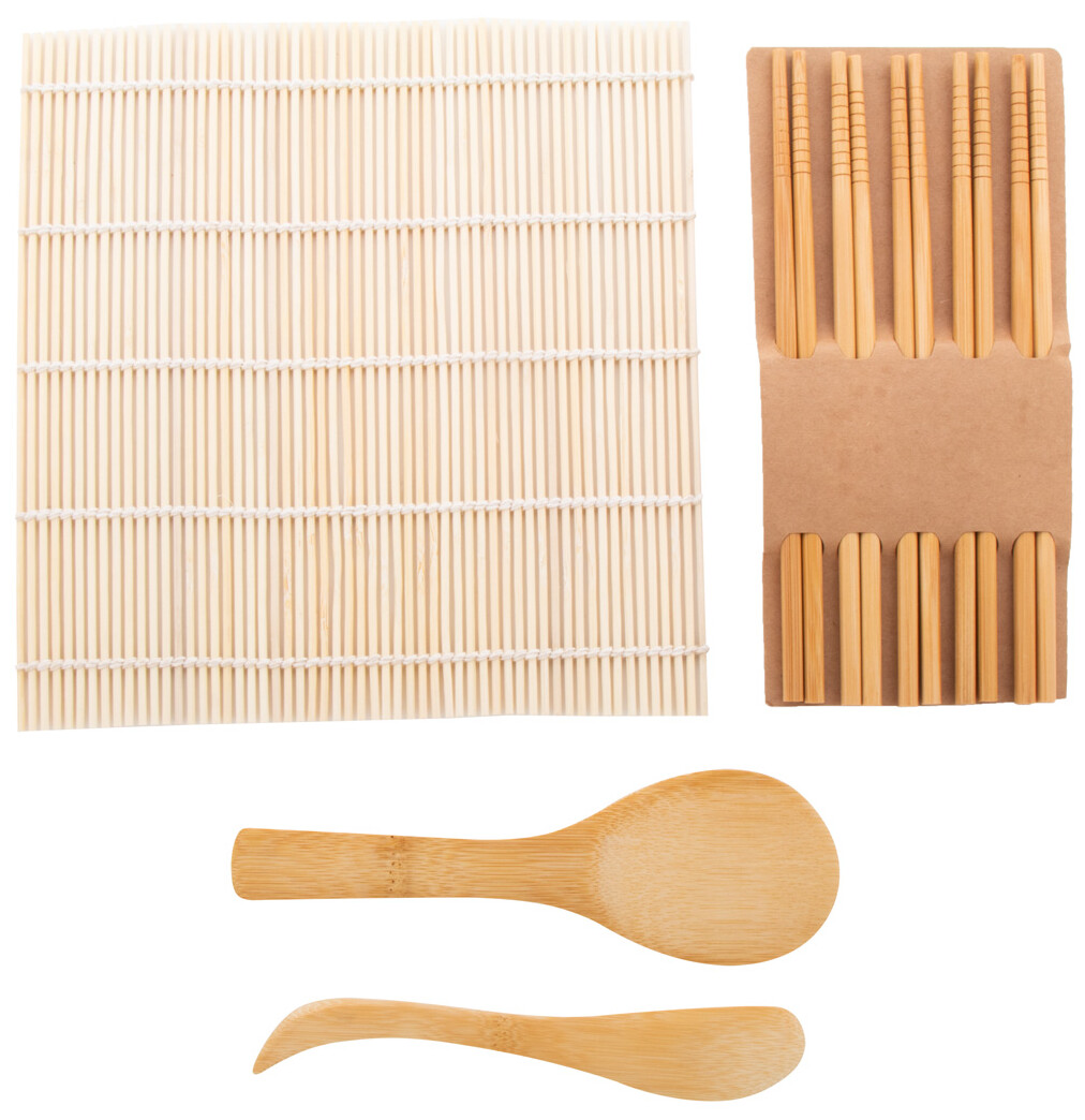 Bambusová sada na přípravu sushi s bambusovou podložkou na sushi, bambusovým nožem a lžící na rýži a 5 páry hůlek. V kraftové papírové krabici.