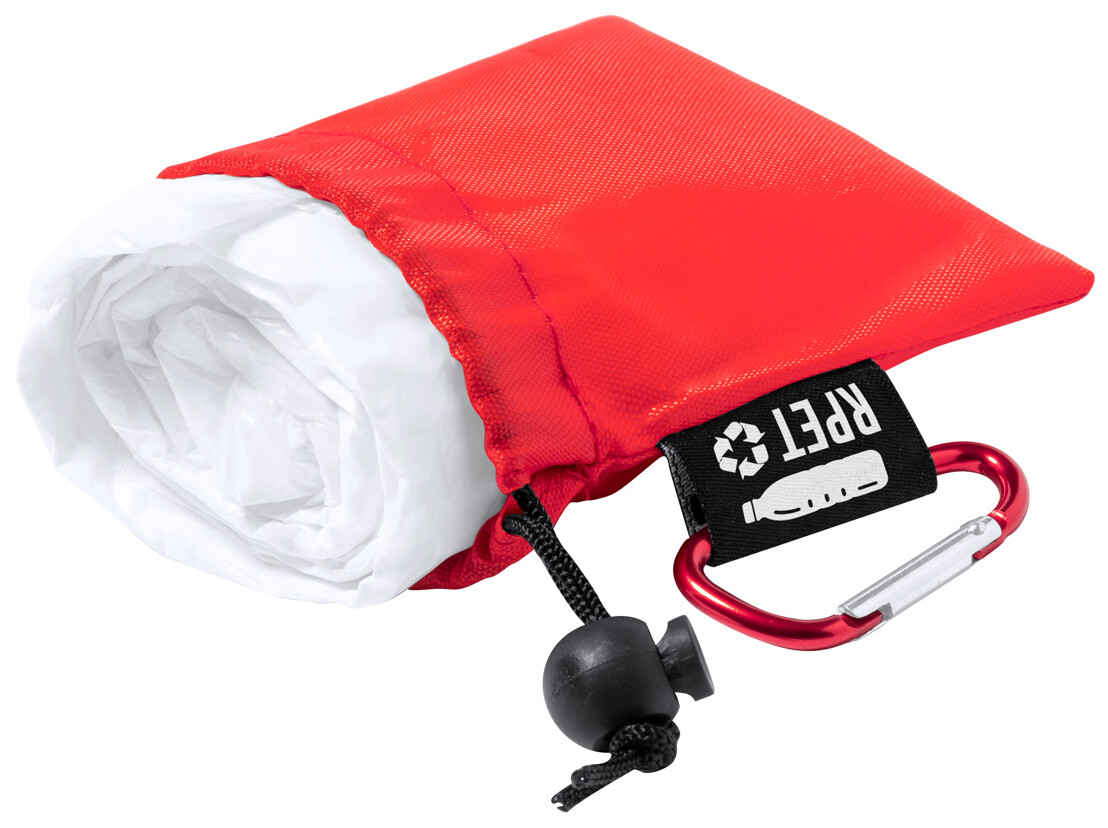 Transparentní LDPE pončo v jedné velikosti pro dospělé. V RPET polyesterovém pouzdru s výrazným štítkem RPET a hliníkovou karabinou.