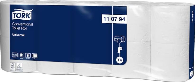 V balení 10 ks, v kartonu 7 balení, Tork toaletní papír v konvenčních rolích v kvalitě Universal splňuje základní požadavky a pro toalety a umývárny s nízkou návštěvností současně nabízí dobrou kvalitu za přijatelnou cenu.