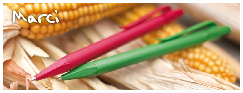 Plastová černá propiska MARCI z kukuřičného PLA plastu (přírodní náhražka plastu vyrobená ze škrobu fermentované rostliny). Velkoobsahová náplň, modře píšící.