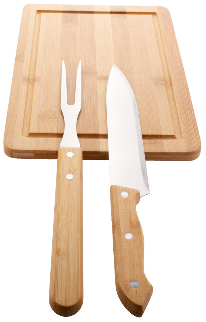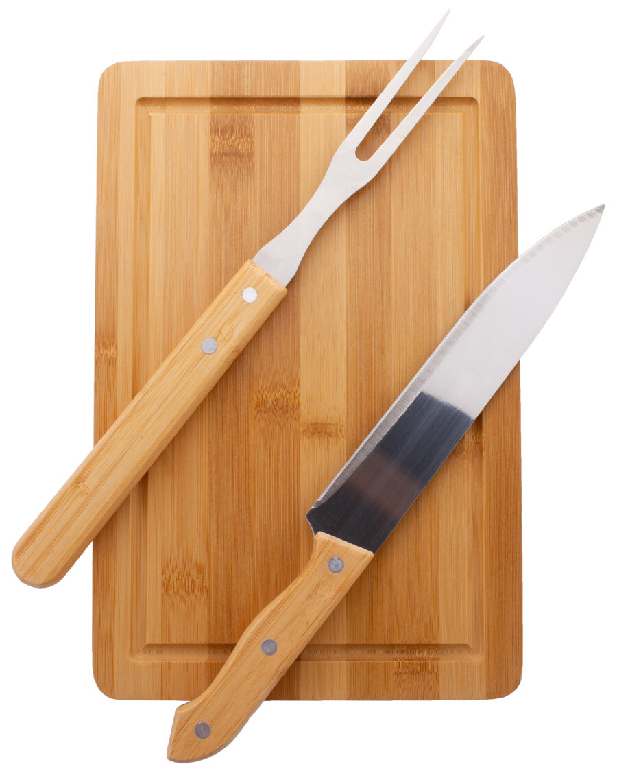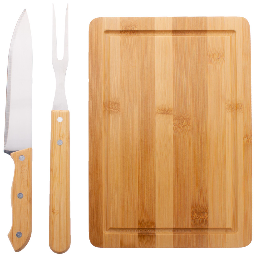 Bambusová sada na krájení masa s bambusovým prkénkem, nerezovou vidličkou a nožem s bambusovými rukojeťmi.
