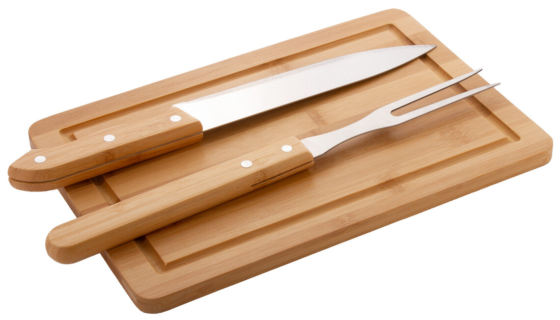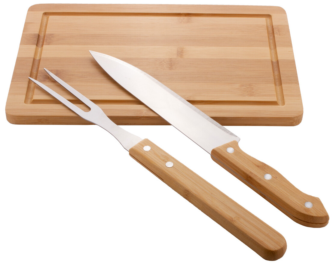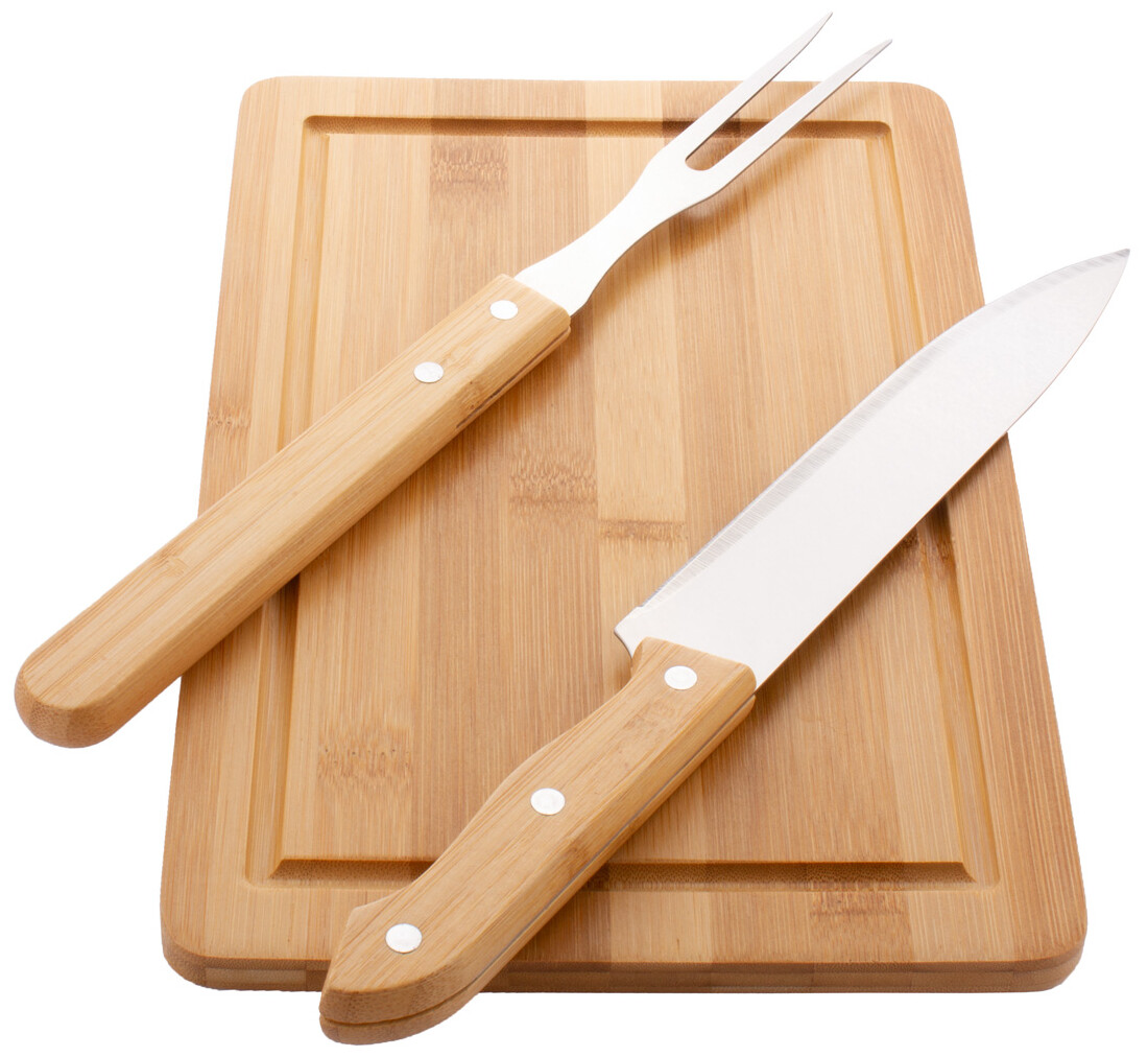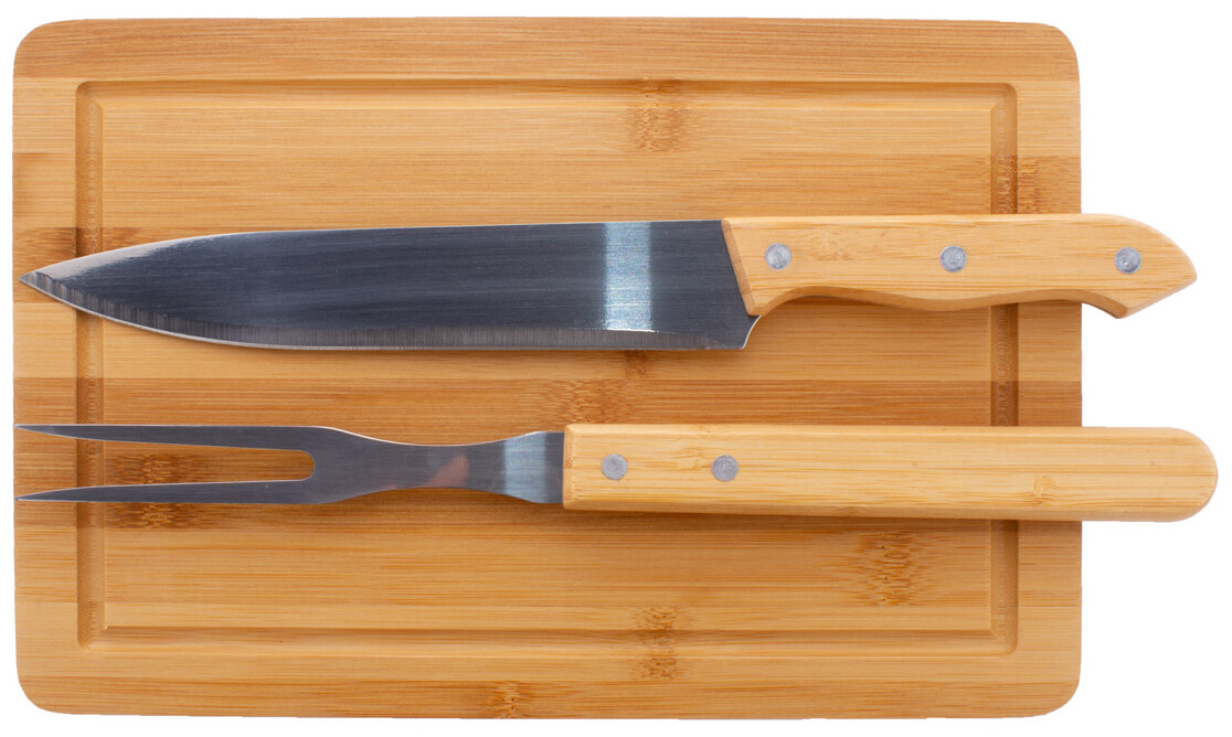 Bambusová sada na krájení masa s bambusovým prkénkem, nerezovou vidličkou a nožem s bambusovými rukojeťmi.