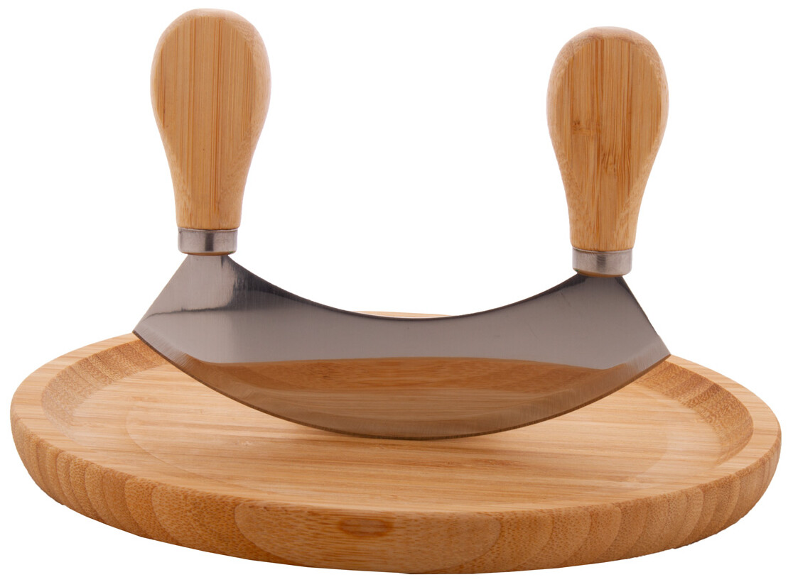 Sada z bambusu na krájení bylin, včetně kulatého bambusového prkénka a nerezového kráječe na bylinky s bambusovými rukojeťmi.