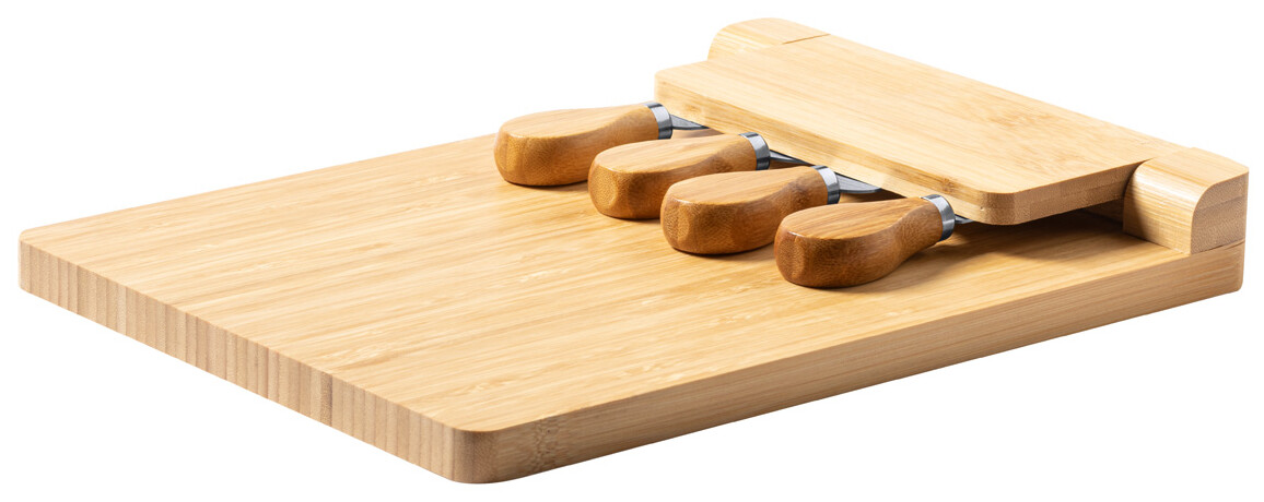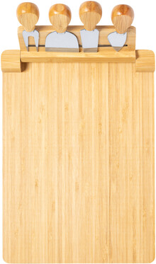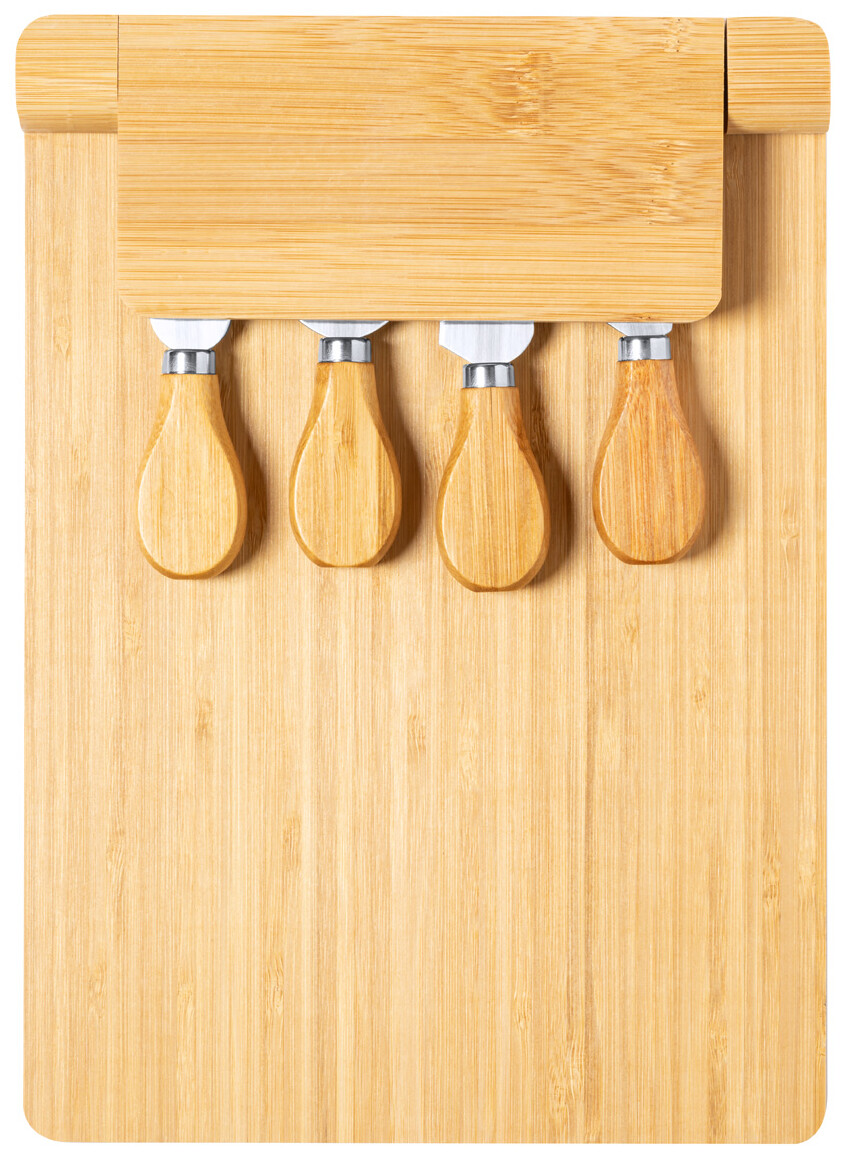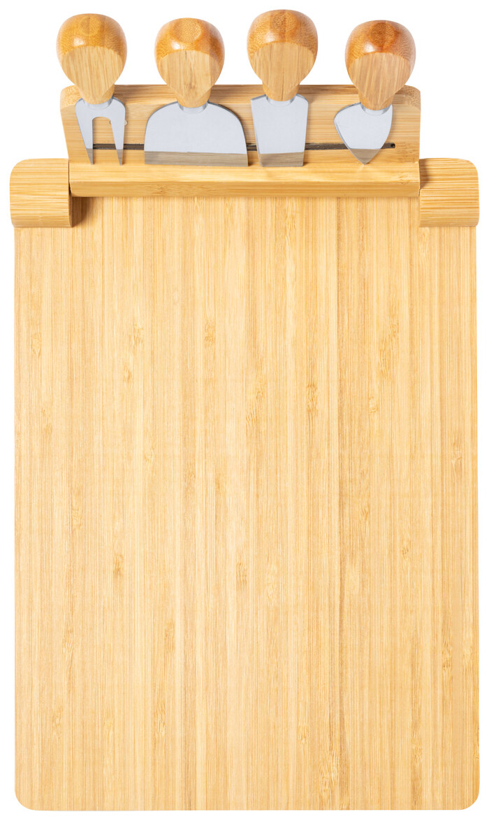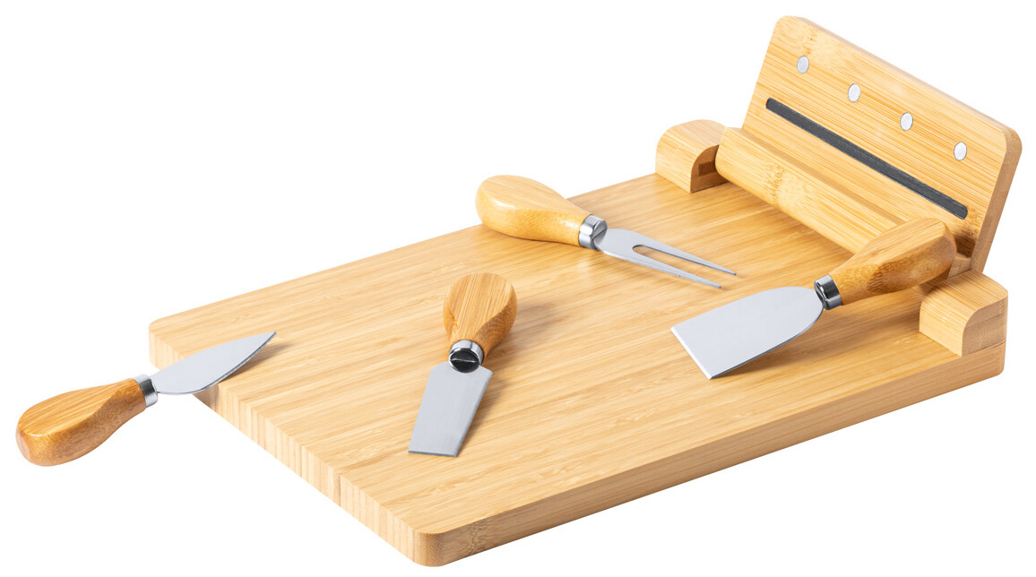 Bambusové prkénko se sadou 4 kusů nerezových nožů na sýr na skládacím magnetickém držáku.