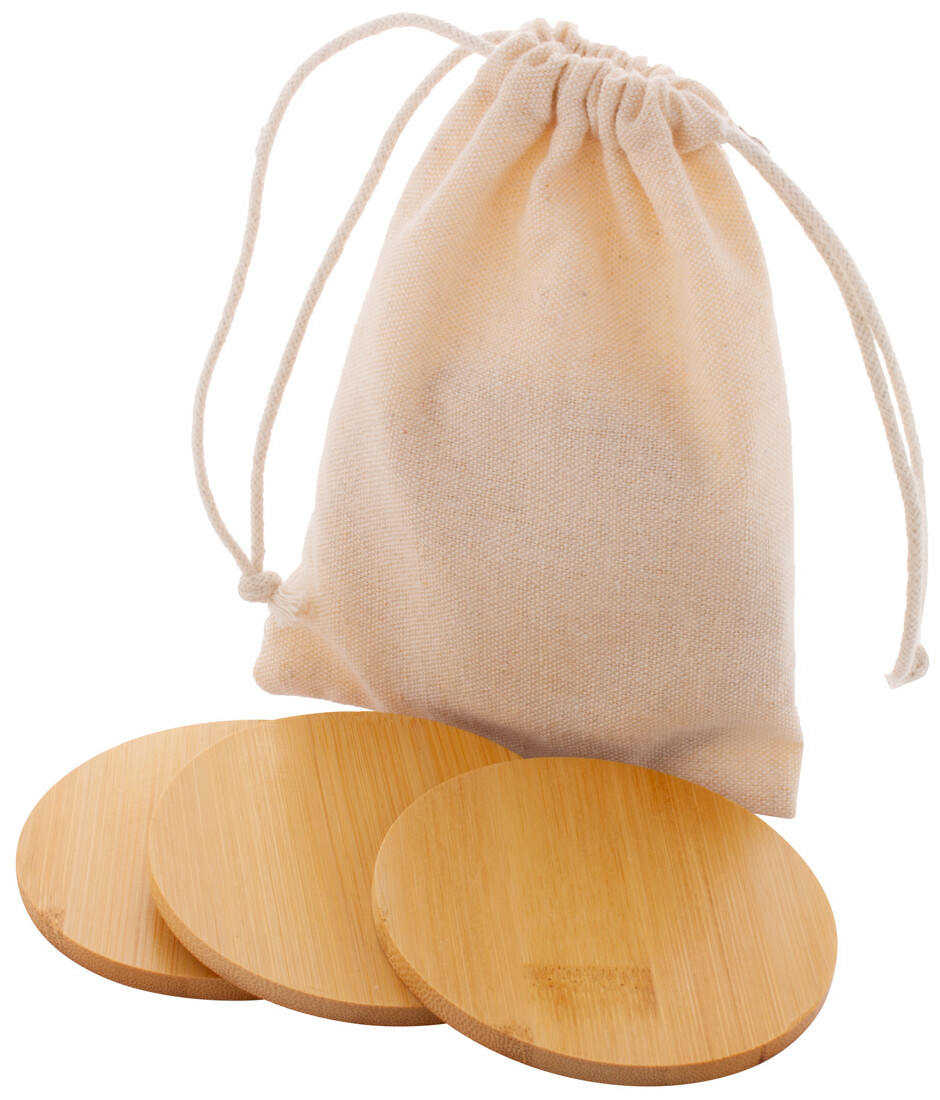 6dílná sada kulatých bambusových podtácků v bavlněném pytlíku se stahovací šňůrkou.