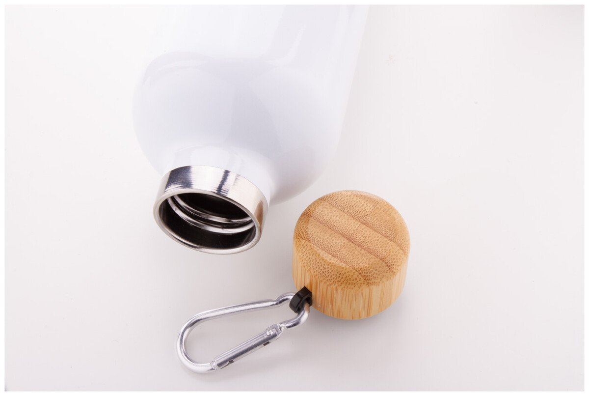 Dvoustěnná nerezová termoska s bambusovým uzávěrem a karabinkou, 500 ml.