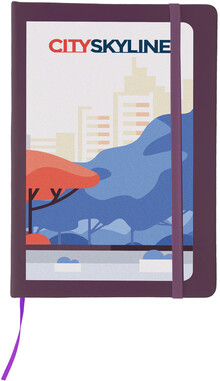 Poznámkový blok se 100 listy, záložkou a gumičkou.