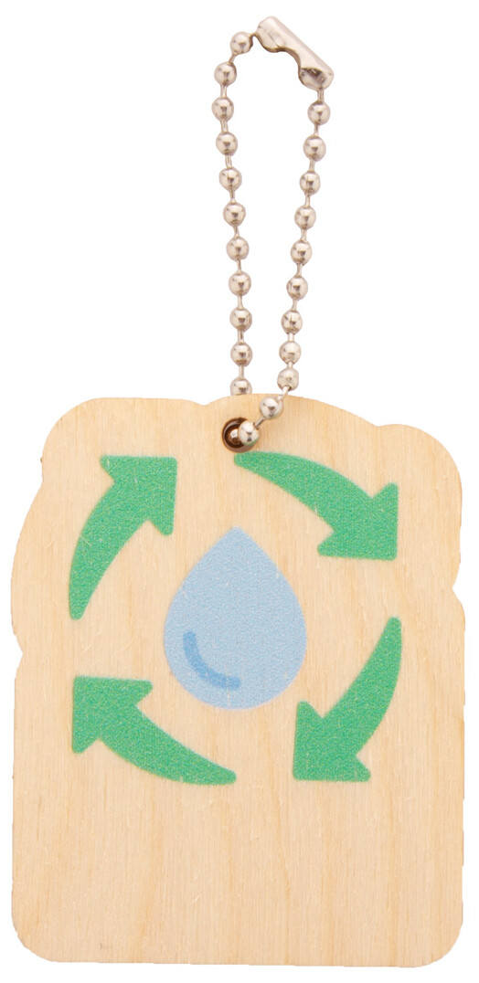 Přívěsek na klíče z březové překližky s kovovým řetízkem a motivem ochrany životního prostředí.