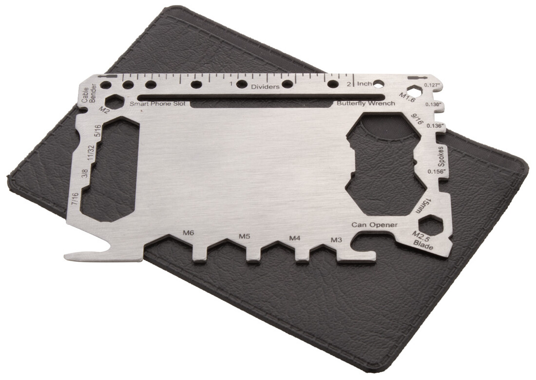 Multifunkční nářadí z nerezové oceli ve tvaru kreditní karty se 20 funkcemi, v pouzdře z PU kůže.