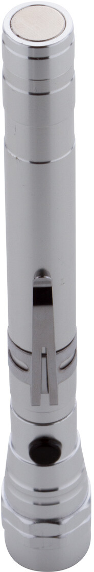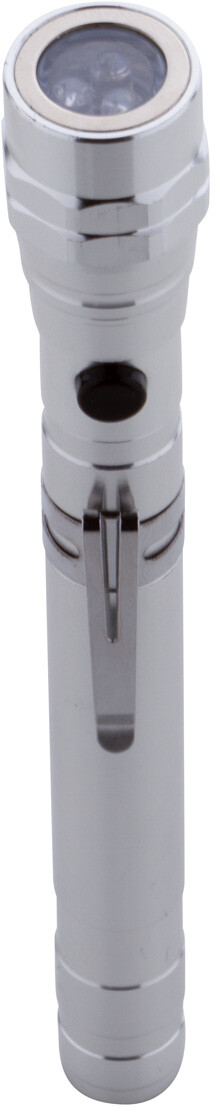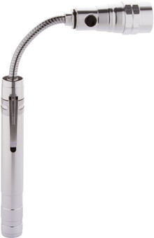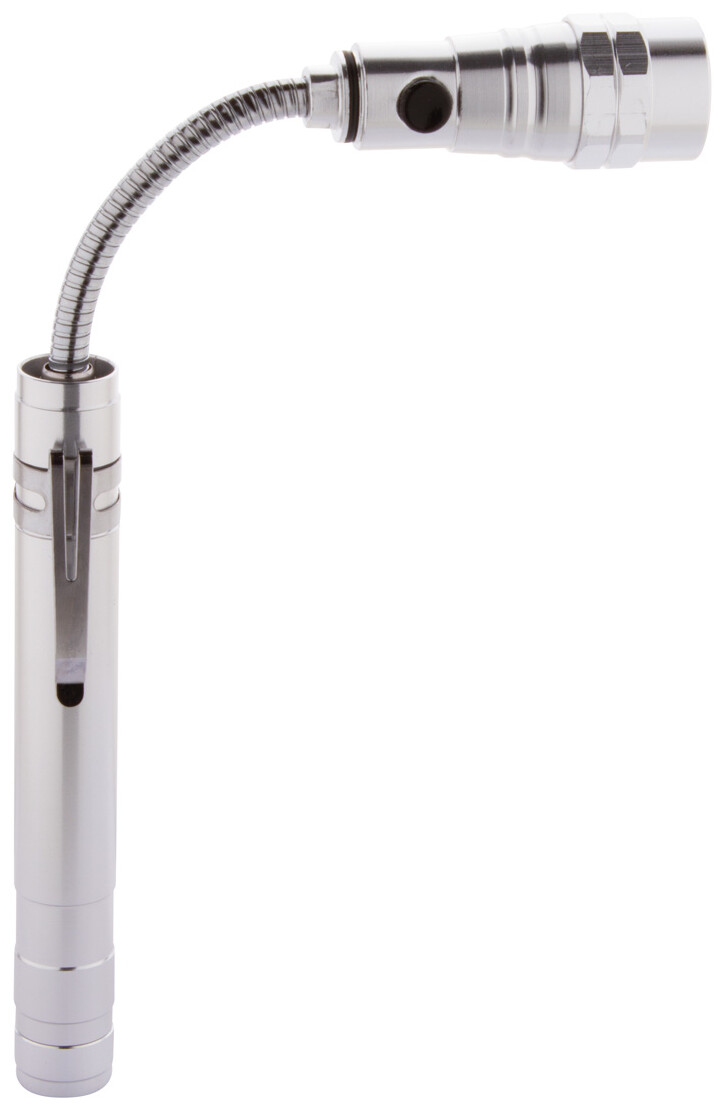 3 LED hliníková svítilna s výsuvnou a flexibilní hlavou, magnetem nahoře a kovovou boční sponou. Včetně knoflíkových baterií. Max. délka: 57 cm.