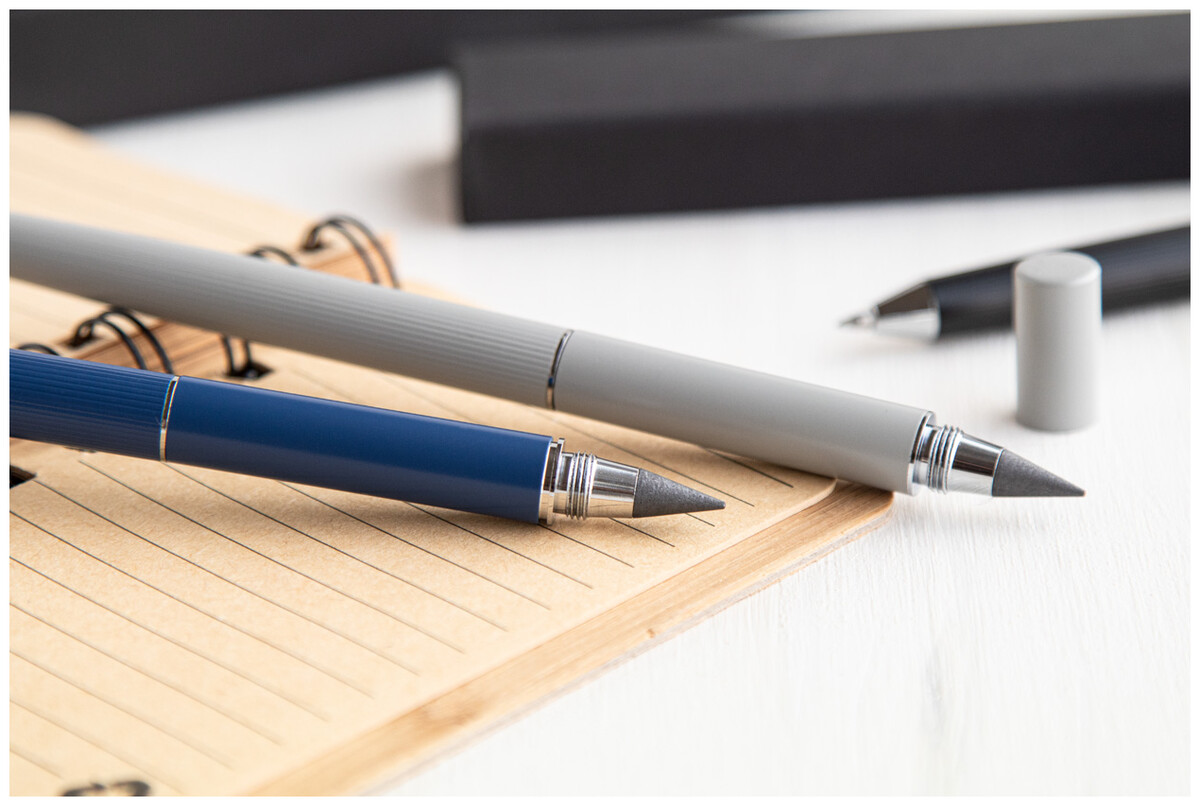 Kovové kuličkové pero 2v1 a pero bez inkoustu v černé dárkové krabičce. S modrou náplní a špičkou z kovové slitiny, která oxiduje papír.