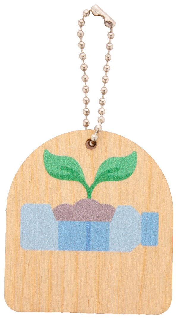 Přívěsek na klíče z březové překližky s kovovým řetízkem a motivem ochrany životního prostředí.