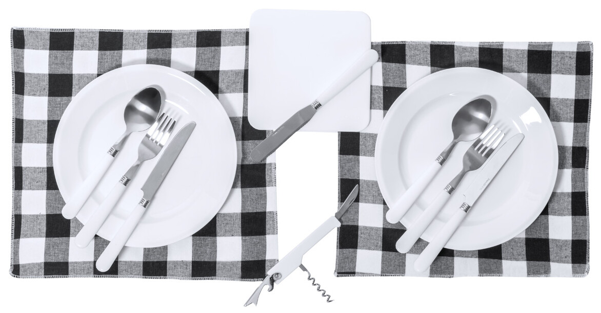 13dílná pikniková sada nádobí a příborů pro 2 osoby v přepravním kufříku z polyesteru 600D RPET na zip.