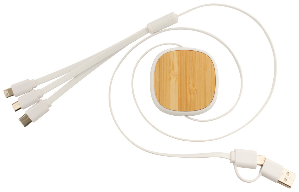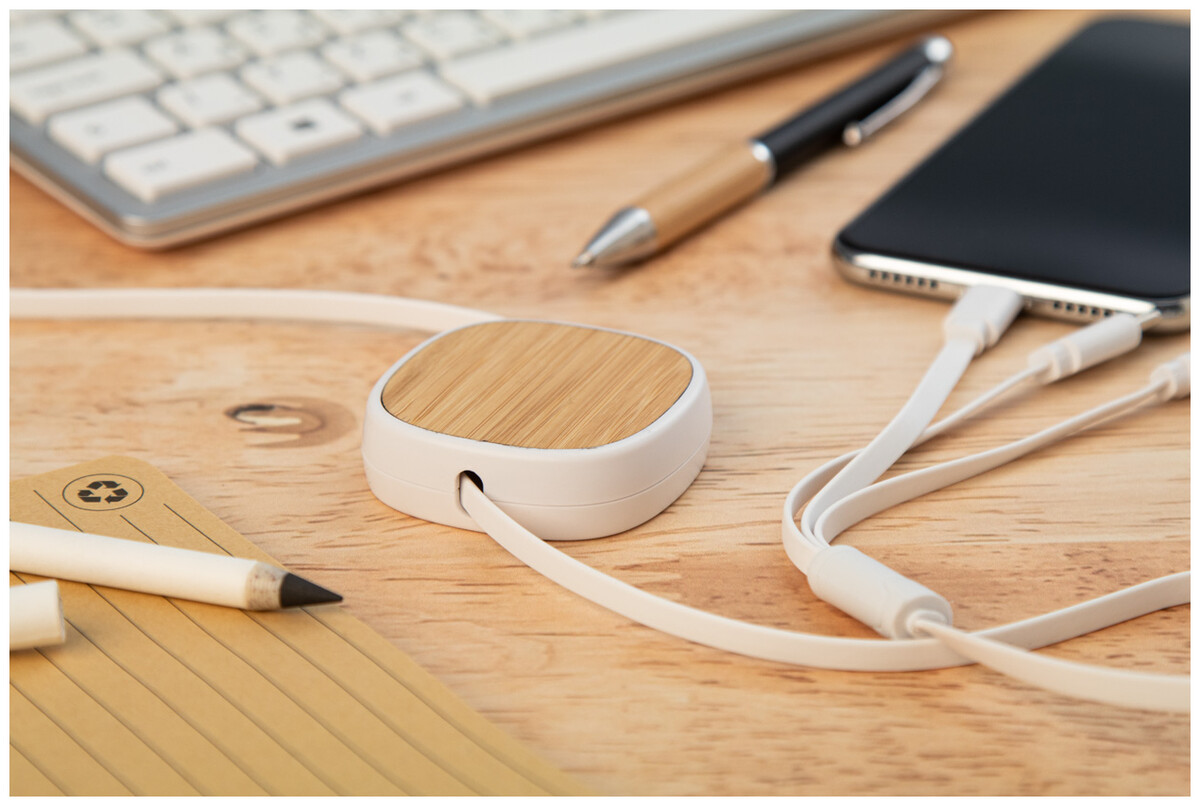 Teleskopický nabíjecí kabel USB z recyklovaného ABS a bambusu. S konektory micro USB, USB-C a Lightning. Se vstupy USB a USB-C.