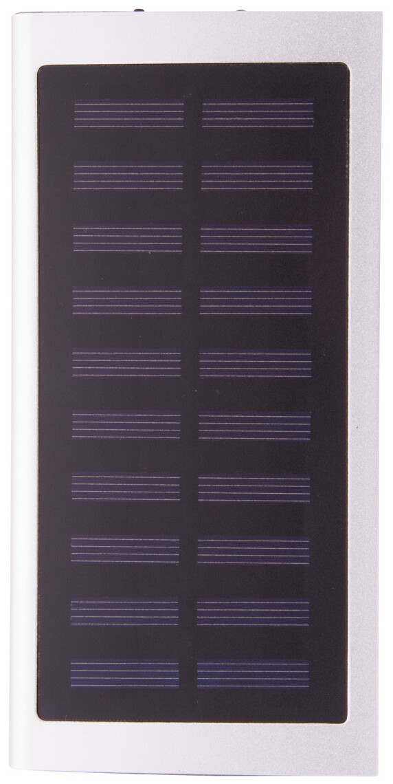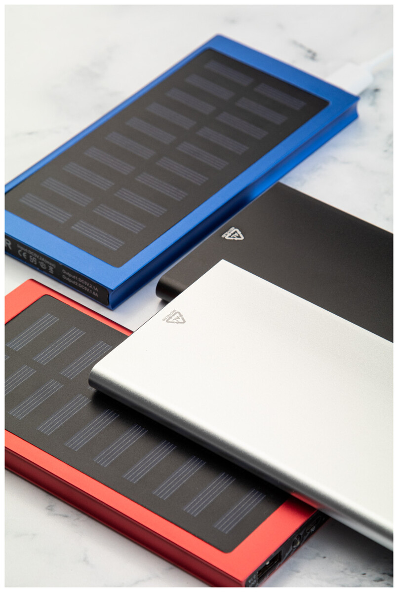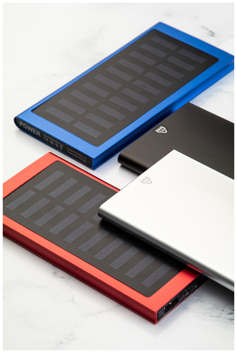 USB power banka v pouzdře z recyklovaného hliníku se zabudovanou solární nabíječkou a 4000 mAh baterií. Se 2 porty USB a 1 portem USB-C pro nabíječku. Vstupní port USB-C. Včetně USB nabíjecího kabelu.