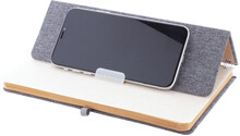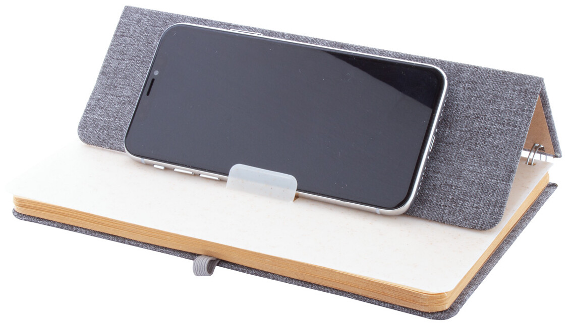 Spirálový blok A5 s deskami potaženými polyesterem RPET s plastovým držákem na mobil a tablet z pšeničné slámy. Se 70 linkovanými listy z recyklovaného kraftového papíru, gumičkou a držákem na pero.