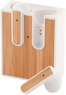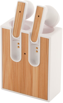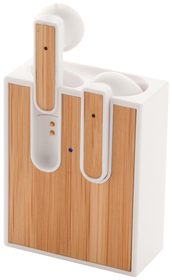 Skutečně bezdrátová stereofonní sluchátka (TWS) s bambusovou vložkou a funkcí hands-free volání. V nabíjecím pouzdře z recyklovaného ABS plastu s bambusovou vložkou. Včetně nabíjecího kabelu USB.