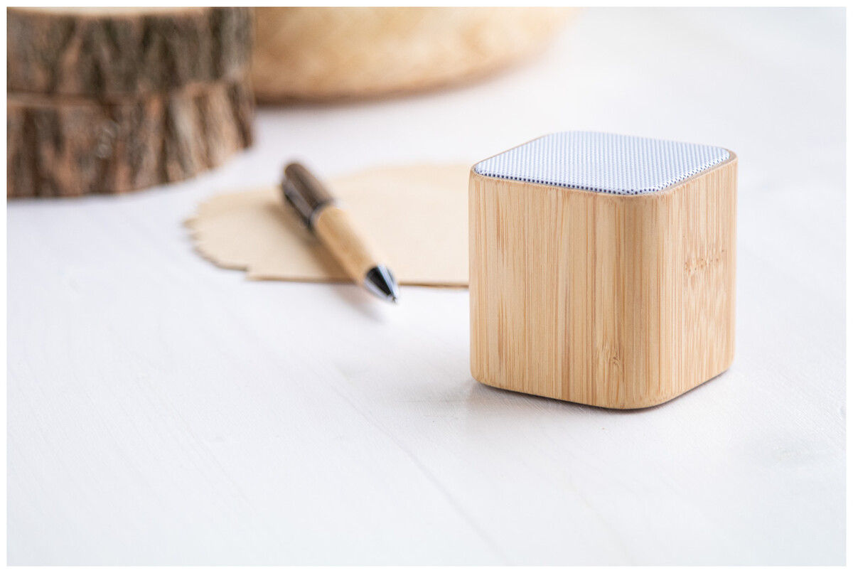 Bezdrátový reproduktor v bambusovém pouzdře s funkcí hands-free volání a vestavěnou dobíjecí baterií. Včetně nabíjecího kabelu USB.