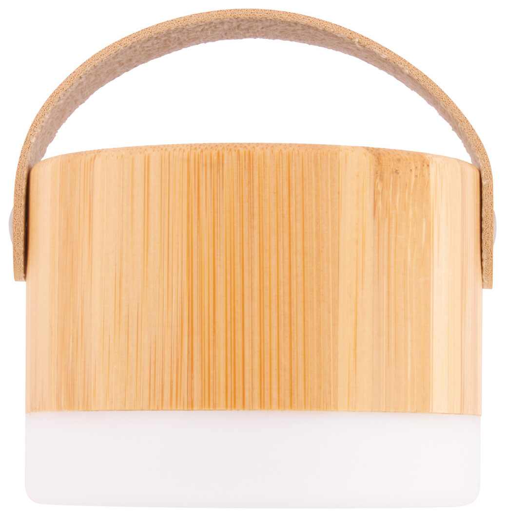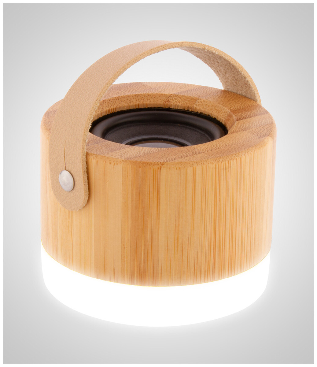 Bezdrátový reproduktor v pouzdře z bambusu a ABS plastu s LED světlem ve spodní části, popruhem z PU kůže a vestavěnou dobíjecí baterií. Včetně nabíjecího kabelu USB.