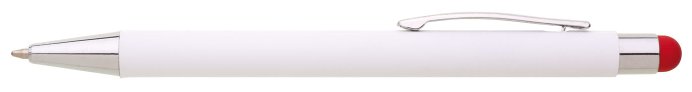 Bílá kovová propiska se soft povrchem a červeným touch koncem. Logo po vylaserování je v barvě touch – leskle červené.