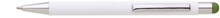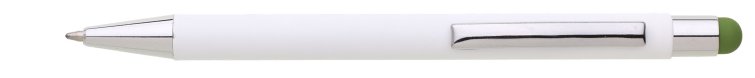 Bílá kovová propiska se soft povrchem a zeleným touch koncem. Logo po vylaserování je v barvě touch – leskle zelená.