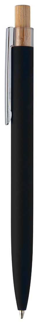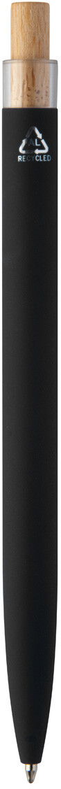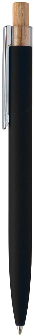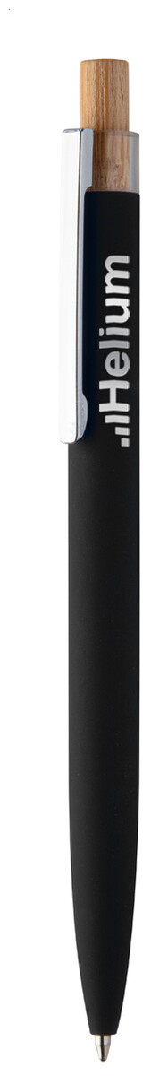 Kuličkové pero z recyklovaného hliníku s pogumovaným povrchem, bambusovým tlačítkem a chromovým klipem. Se speciální vrstvou pro zrcadlové laserové gravírování. S modrou náplní.