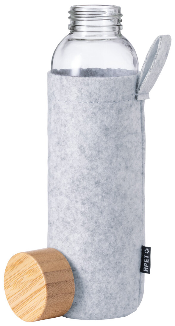 Skleněná láhev s bambusovým uzávěrem a plstěným obalem RPET, 500 ml. Nevhodné pro sycené nápoje.