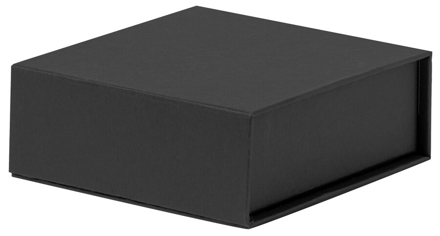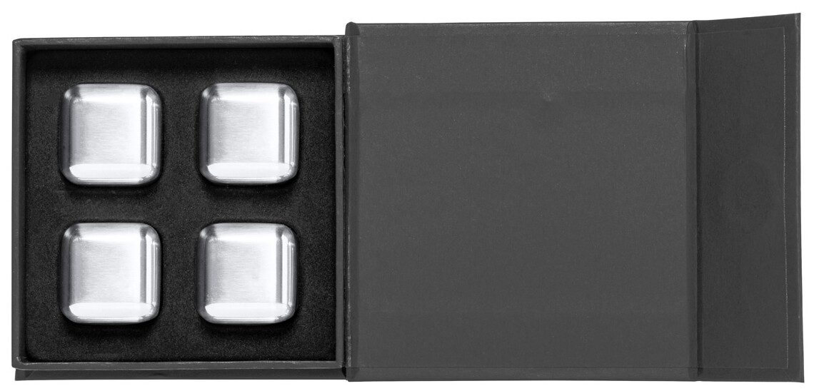 4dílná opakovaně použitelná sada chladících kostek z nerezové oceli v černé dárkové krabičce.