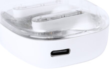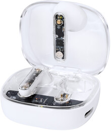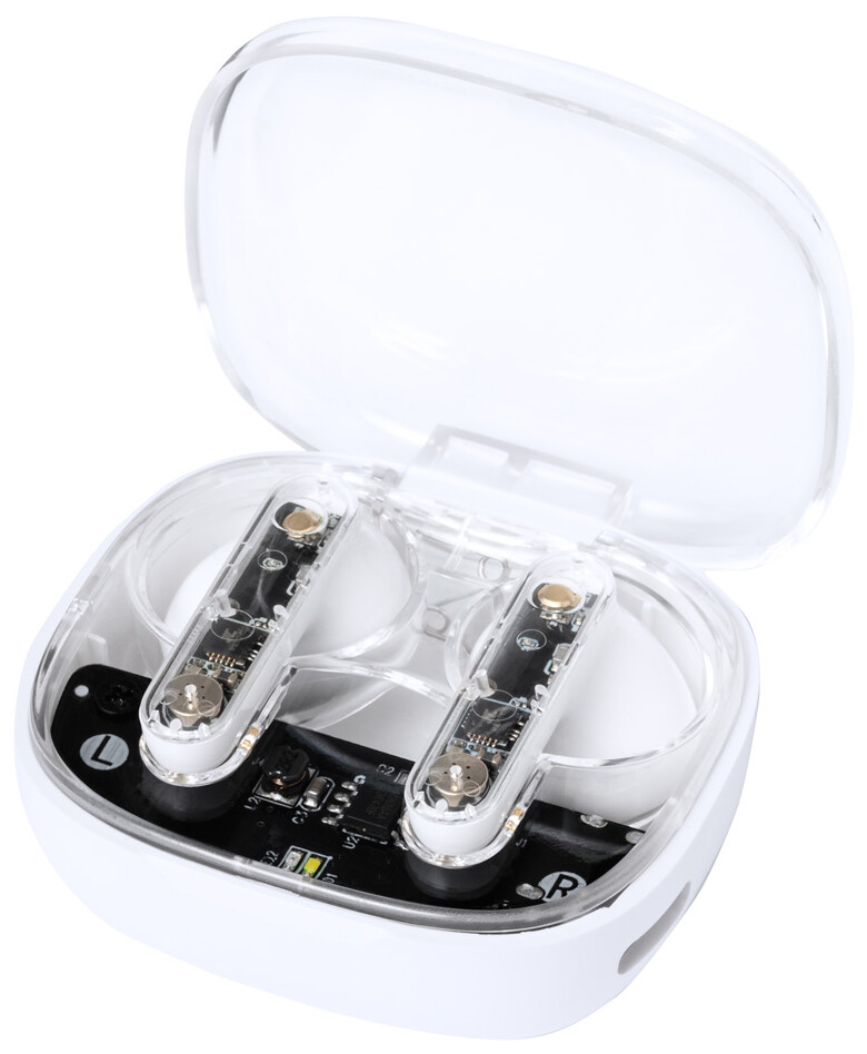 Poloprůhledná, skutečně bezdrátová stereofonní sluchátka (TWS) s viditelnými elektronickými součástmi a funkcí hands-free volání. V poloprůhledném plastovém pouzdře s nabíječkou. Včetně nabíjecího kabelu USB.