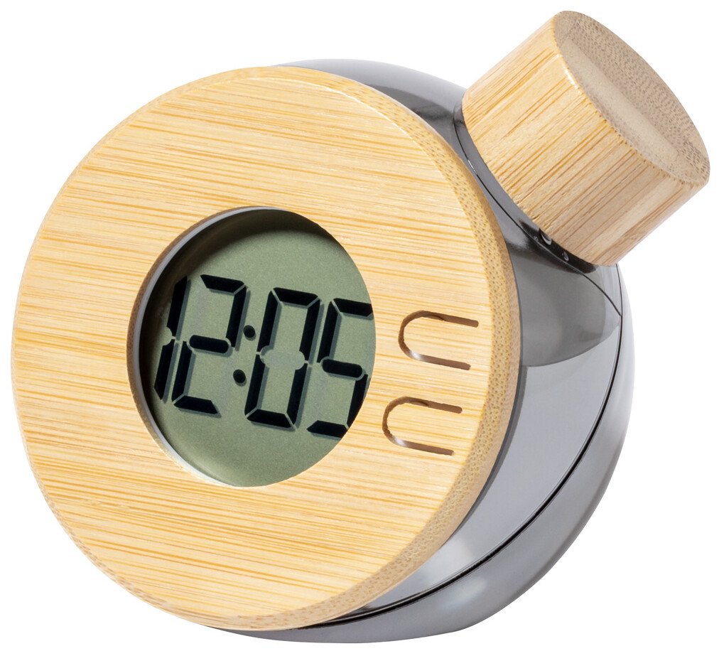 Vodou poháněné digitální stolní hodiny v plastovém pouzdře s bambusovými detaily.