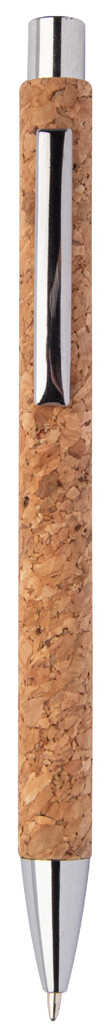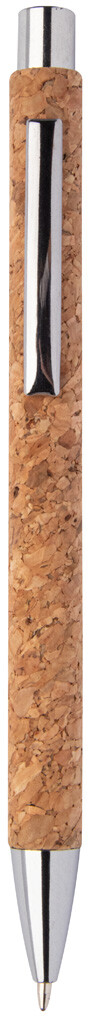 Kuličkové pero z recyklovaného papíru potažené přírodním korkem s kovovými částmi. S modrou náplní.