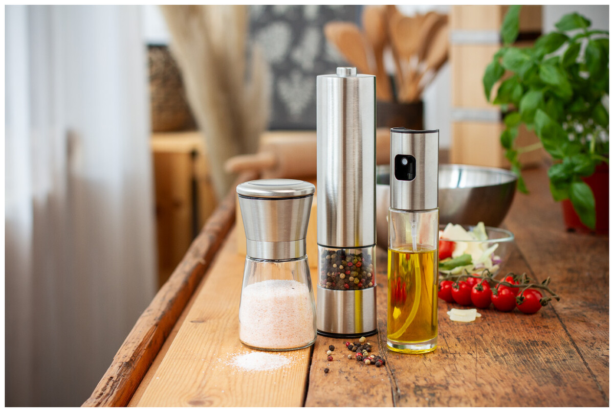 Nerezový elektrický mlýnek na sůl a pepř s keramickým jádrem mlýnku a LED osvětlením. Funguje na 4 AA baterie, bez baterií.