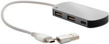 USB hub z recyklovaného hliníku a recyklovaného ABS se 2 USB a 1 USB-C portem, USB 2.0. Včetně kabelu s připojením USB a USB-C.
