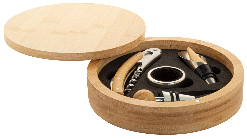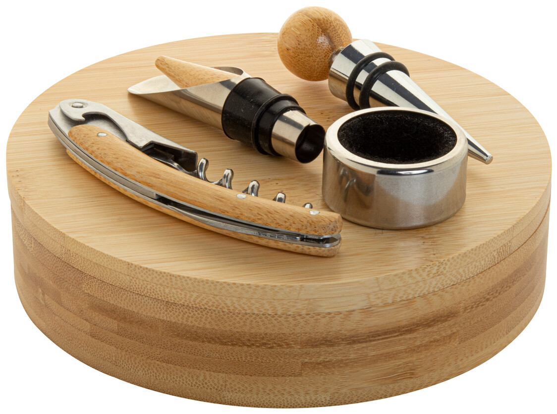 4dílná sada na víno z nerezové oceli vykládaná bambusem v kulaté bambusové krabičce. Včetně vývrtky, zátky, kroužku a nálevky.