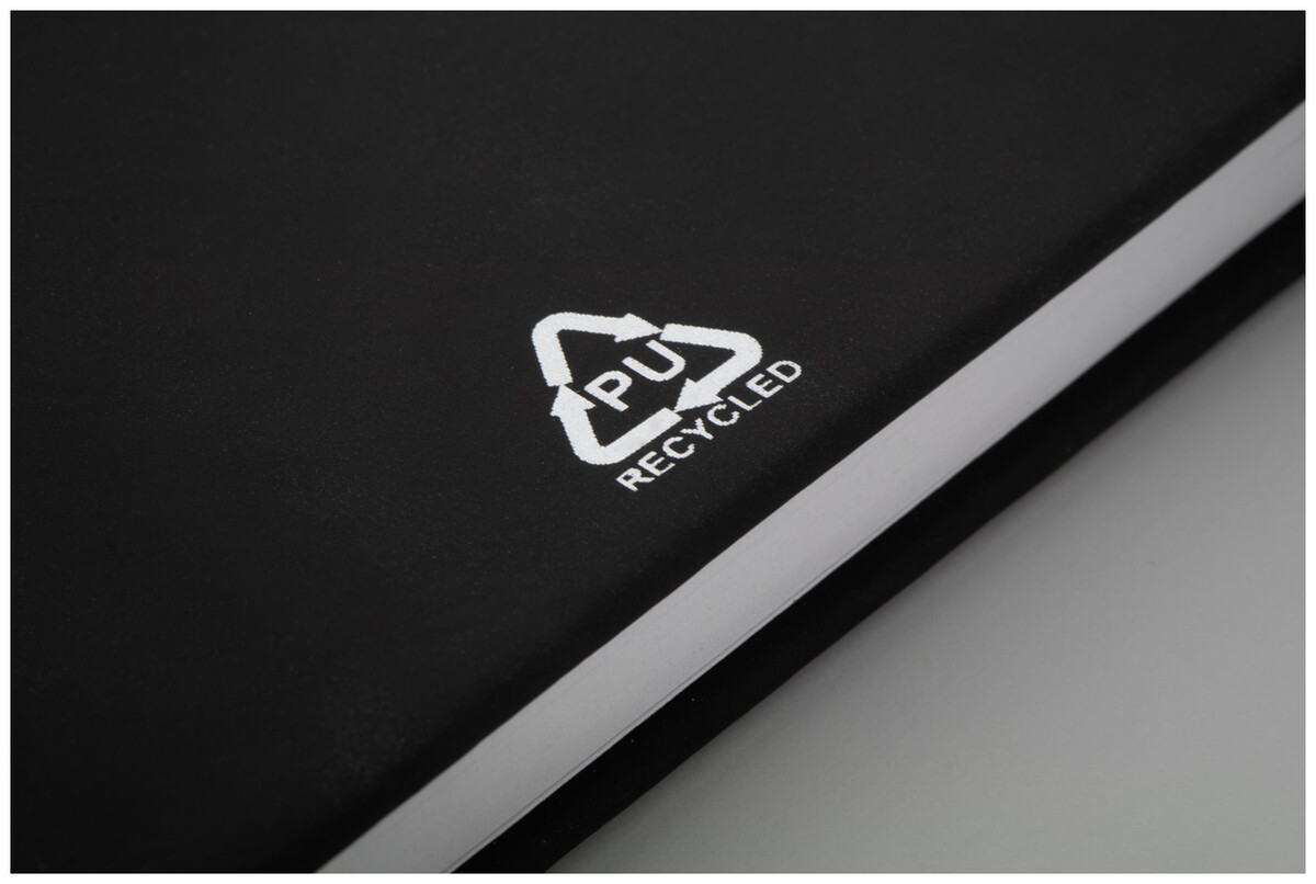Blok potažený recyklovanou PU kůží se 100 linkovanými listy z recyklovaného papíru. Se záložkou v odpovídající barvě a gumičkou. Velikost A5.