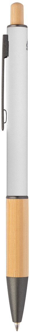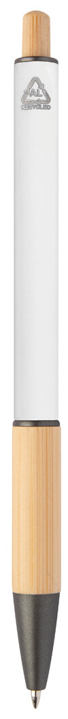 Kuličkové pero z recyklovaného hliníku s bambusovým úchopem a tlačítkem, pogumovaným tělem a kovovými částmi. S modrou náplní.