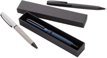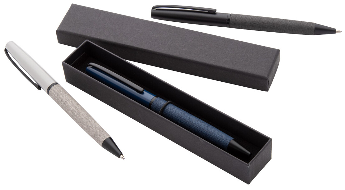 Elegantní kovové kuličkové pero s tělem potaženým PU kůží a černými částmi. V černé dárkové krabičce. S modrou náplní.