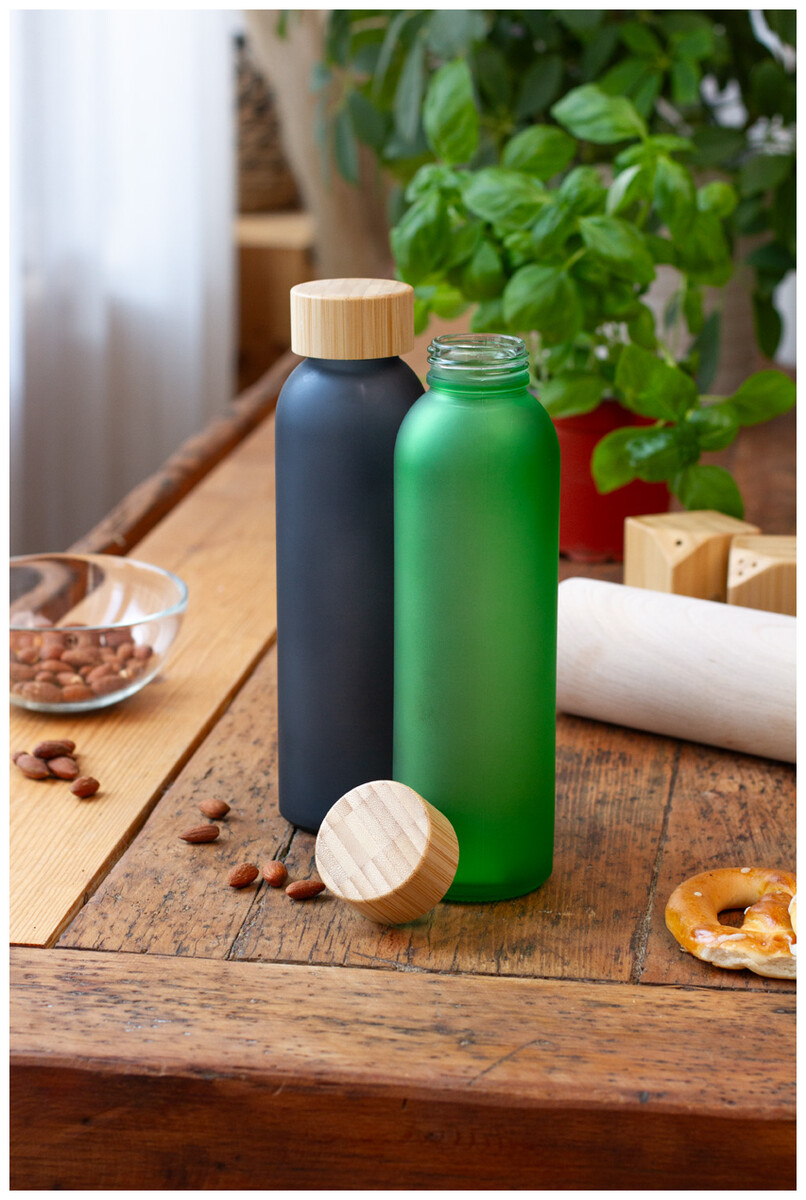 Láhev z matného skla s bambusovým uzávěrem, 500 ml. Nevhodné pro sycené nápoje.